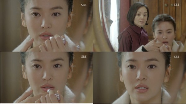 송혜교는 세심하게 손으로 입술선을 짚어가며 꼼꼼히 립스틱을 바르며 완벽히 시각장애인의 모습을 선보였다.