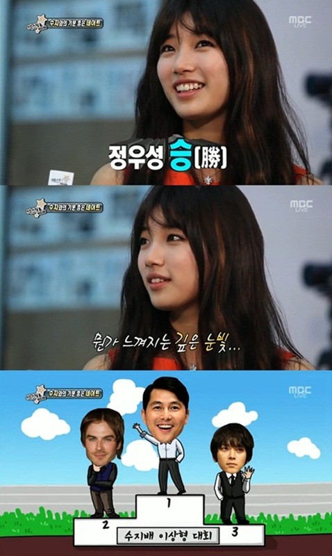 또, 수지는 이안 소머헐더와 정우성 중 누가 더 좋은가라는 리포터의 질문에 “당연히 정우성 선배님이다. 뭔가 느껴지는 깊은 눈빛이 매력적이다”라고 말했다. 이로써 수지의 이상형 1위는 정우성이 차지했으며, 이안 소머헐더와 강동원이 그 뒤를 이었다.
