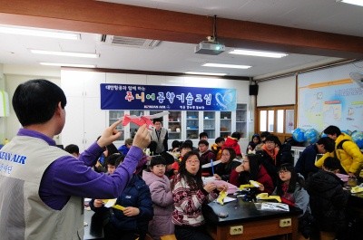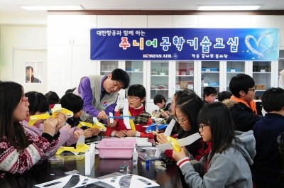 대한항공은 이날 학생들에게 ‘라이트형제 따라잡기’란 제목으로 비행기의 역사와 원리 등을 가르쳤다.