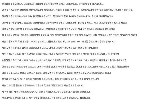 장문의 해명글까지..대체 뭐가 진짜야?'박시후가 강간 혐의로 피소됐다'는 충격적인 사실이 알려진 직후 온라인상에 박시후가 직접 남겼다는(?) 정체불명의 '해명글'이 떠돌고 있어 의문이 증폭되고 있다.