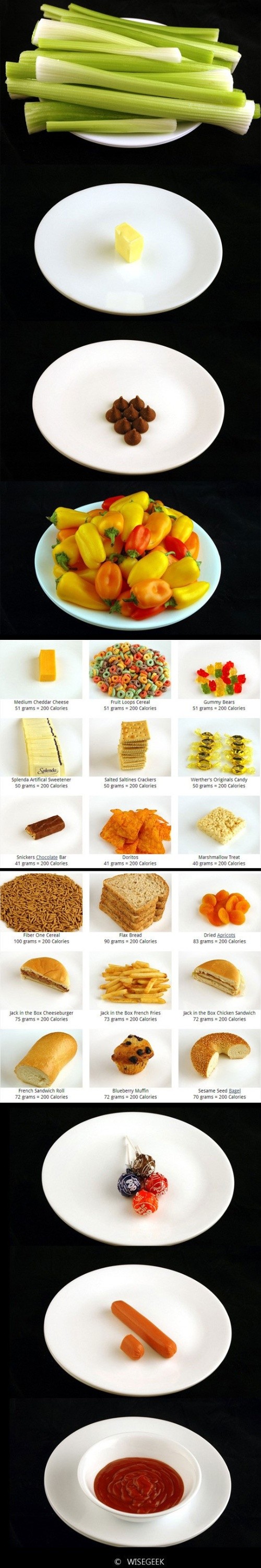 게시물에 따르면 치즈버거 반 조각, 체다치즈 51g, 계란 150g, 감자튀김 7g, 우유 331ml, 막대사탕 4개 등이 200 칼로리에 해당한다. 샐러리 1420g과 콜라 496ml는 세 배 가까이 양의 차이가 나지만 이들의 칼로리는 200kcal로 동일하다.