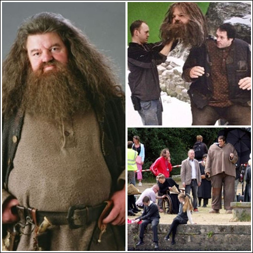 공개된 사진은 해그리드 역을 맡은 영국 배우 로비 콜트레인의 모습이 담겼다. 그는 해그리드로 변신하기 위해 거대한 얼굴 모양의 가면을 쓰고 있으며, 촬영 직후에는 가면을 벗고 쉬고 있다.