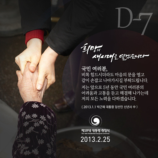 ⓒ 대통령직 인수위원회 △ 'D-7' 웹 포스터에는 박 당선인이 한 노인의 손을 잡은 사진이 담겼다. 이와 함께 '앞으로 5년 동안 국민 여러분의 어려움과 고통을 듣고 해결해 나가는 데 모든 노력을 다하겠다'는 지난 1월1일 박 당선인의 신년사가 들어갔다.