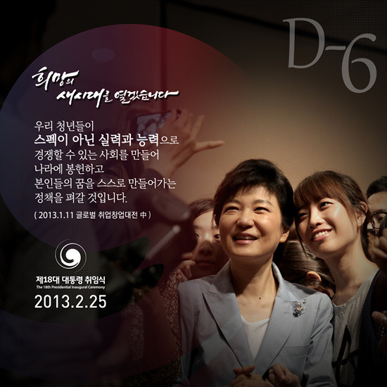 ⓒ 대통령직 인수위원회 △ 'D-6' 웹 포스터에는 박 당선인이 청년들과 찍은 사진과 함께 '청년들이 스펙이 아닌 실력과 능력으로 경쟁할 수 있는 사회를 만들겠다'는 지난 1월11일 글로벌 취업창업대전에서의 메시지가 담겼다.
