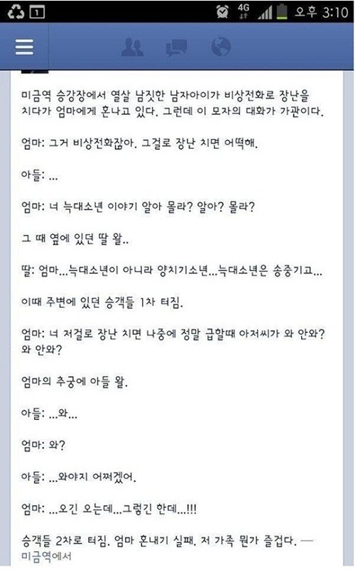 비상전화로 장난을 하는 아들에게 엄마는 “그걸로 장난치면 어떡해. 너 늑대소년 이야기 알아? 몰라?”라고 훈계하자 이에 옆에 있던 딸은 “엄마. 늑대소년이 아니라 양치기 소년. 늑대소년은 송중기고”라고 정정해 웃음을 자아낸다.화가 난 엄마는 “너 저걸로 장난치면 나중에 정말 급할 때 아저씨가 와? 안와?”라고 다시 혼내지만 아들은 “와야지. 어쩌겠어”라고 아무렇지 않게 말해 지하철에 타고 있던 승객들과 엄마는 웃음을 참지 못했다고.