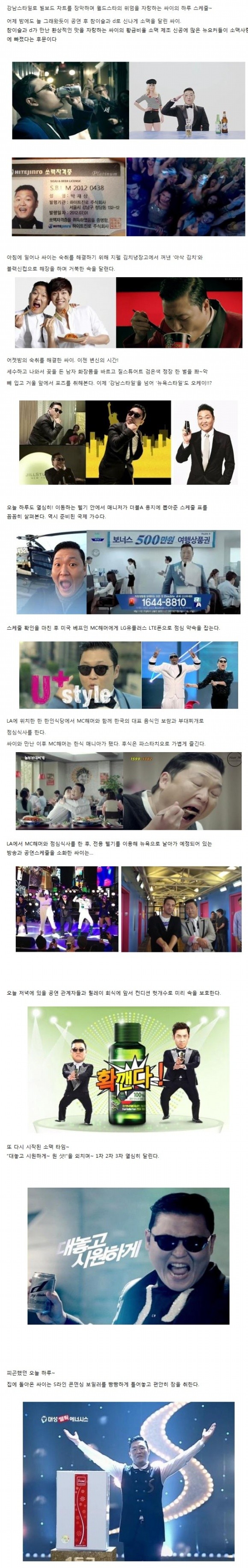 한편, 싸이의 하루는 당대 최고 CF 스타였던 ‘이영애의 하루’, ‘이효리의 하루’ 에 이은 3번째 하루 시리즈로 이는 싸이가 명실상부 최고의 CF 스타로 자리매김 했다는 방증이다.