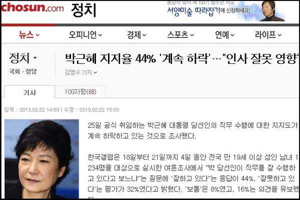 <박근혜 지지율 44% '계속 하락'…'인사 잘못 영향'>이라는 조선닷컴의 보도에 “김대중 노무현 이명박 정권 15년간 꾸준히 신문 방송 등 언론을 장악한 종북추종자들이 이젠 자신들이 올렸다 내렸다를 자유자재로 하는 여론조사로 압박을 가하려고 하는데, 이런 조사를 아직도 믿는 국민이 있을 거라 생각하면 오산이다. 그리고 박근혜 관련 여론조사가 지금까지 한 번이라도 맞은 적이 있었나?”라는 네티즌(khj****)의 주장이나 “또 믿지 못할 여론조사로 초장부터 문고리 흔드는 놈들을 처단하라. 이제 겨우 30일 지났다, 이 XX들아”라는 네티즌(goldenk****)의 주장에서 좌익선동세력에 속지 않는 국민의 지혜를 감지한다. 집권에 실패한 좌익선동세력이 여전히 언론을 장악한 상태에서 공직후보자들의 결함을 침소봉대해서 새 정부를 마녀사냥한다는 사실을 국민들은 알고 있다. 이명박 정부의 초기에 사사건건 딴죽 걸었던 박근혜 당선자는 자신에게 우호적인 언론매체가 없다는 사실을 뼈저리게 느낄 것이다.