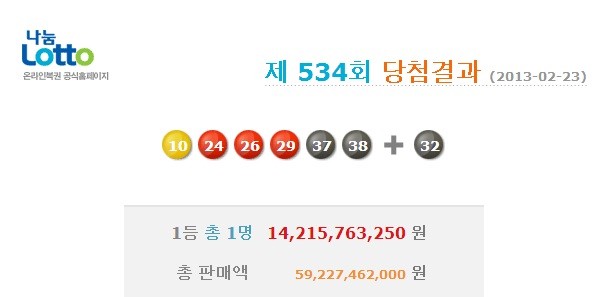 2013년 2월 23일 실시된 제534회 나눔로또 1등 당첨번호는 '10, 24, 26, 29, 37, 38'번이며, 2등 보너스 번호는 32번이다.