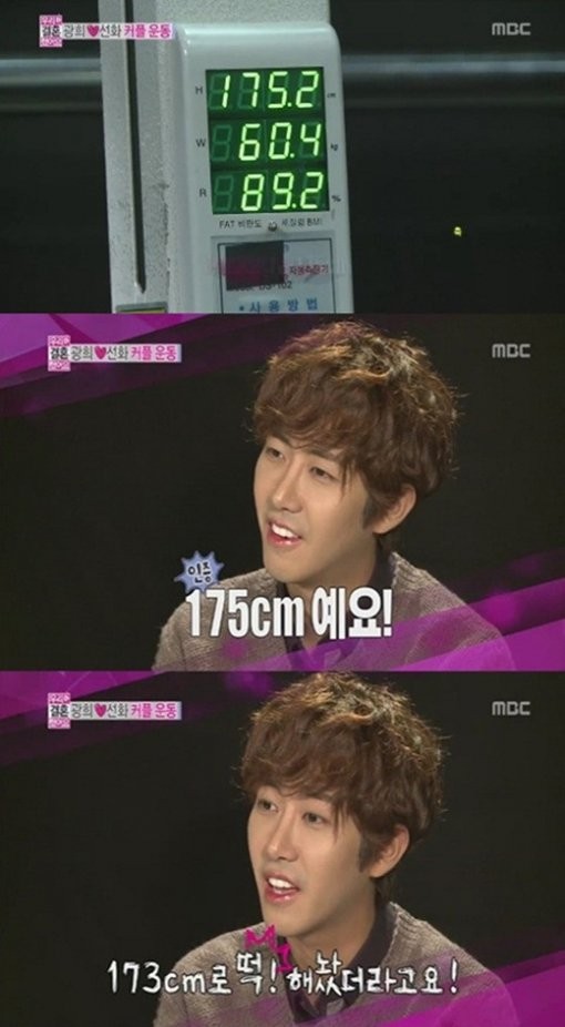 이날 황광희는 운동에 앞서 키 측정에 나섰다. 그 결과, 황광희의 키는 175cm에 몸무게 60kg으로 측정됐다. 하지만 황광희의 프로피상 몸무게는 173cm.