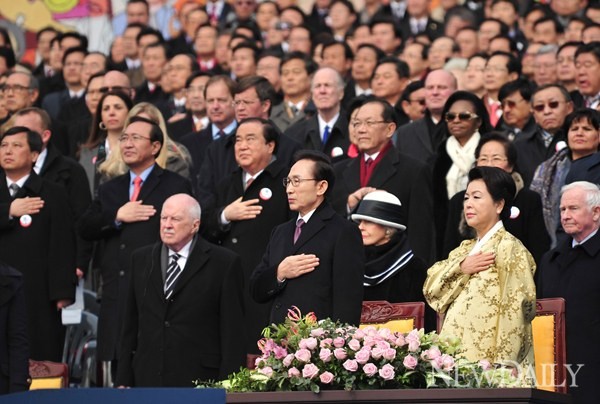 [포토] 국기에 대한 경례하는 '이명박' 전 대통령 내외