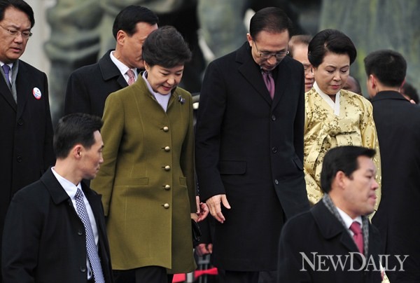 [포토]이명박 전 대통령 환송하는 '박대통령'