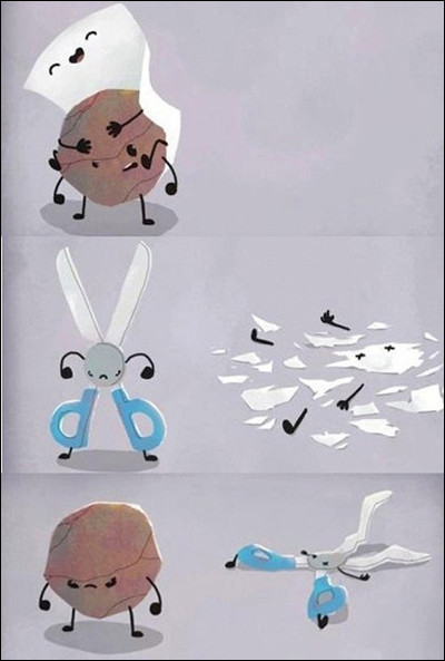 게재된 사진에는 귀엽게 그려진 가위바위보 캐릭터의 모습이 담겨 있다. 게시물 작성자에 따르면 바위와 보는 단짝 친구인데, 둘 사이에 갑자기 끼어든 가위가 보를 찢어버린다. 이에 분노한 바위는 보의 원한을 갚아주기 위해 가위를 처절하게 응징한다.