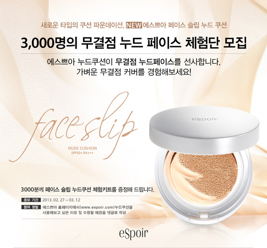 3월 12일까지 에스쁘아 공식 홈페이지를 통해 공개 모집한다. 본인이 원하는 매장에서 페이스 슬립 누드 쿠션 체험 키트를 수령 후 체험해보는 형식이다.