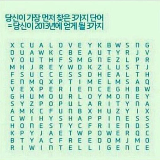 공개된 사진에는 올 한해 얻게 될 것들이 담겨 있는 단어 퍼즐이 담겨 있다. ‘당신이 가장 먼저 찾은 3가지 단어=당신이 2013년에 얻게 될 3가지’란 설명과 함께 영어 알파벳이 무작위로 나열돼 있는 모습이다.