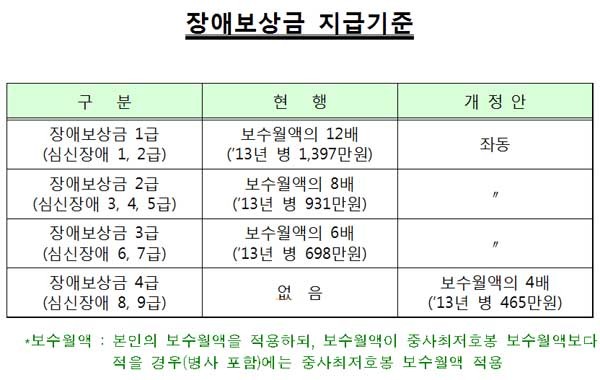 개정되는 시행령에 따르면 심신장애 8·9급 판정을 받고 전역하면 보수월액의 4배(2013년 병사 기준 465만 원)에 해당하는 장애보상금을 받게 된다.