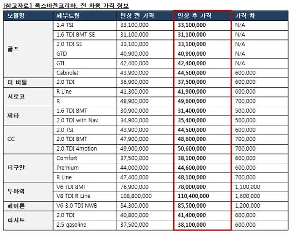 이번 가격인상은 골프 2.0 TDI, 1.6 TDI, 1.4 TSI, GTD, GTI를 제외한 모델 전체에 적용된다.