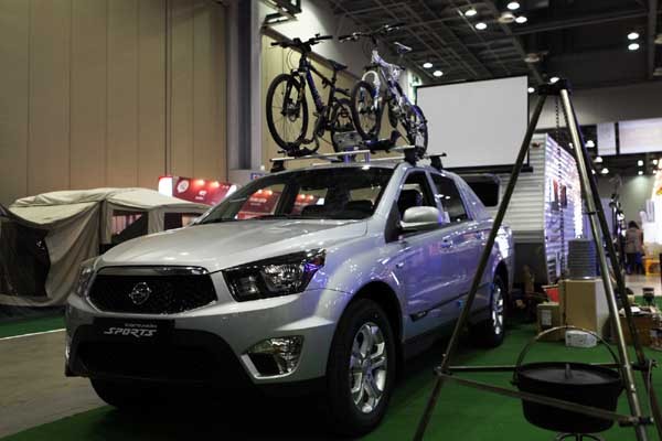 국내 유일의 픽업트럭 코란도스포츠는 2.04㎡의 뒤편 데크에 슬라이드 베딩과 자전거 거치대를 설치하고 나타났다.