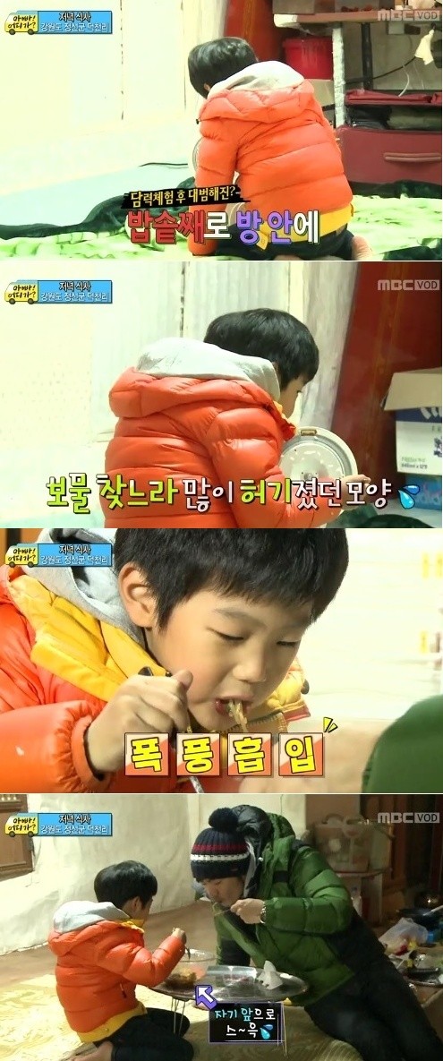 배우 이종혁의 아들 준수가 폭풍 흡입한 모습이 포착돼 아빠 미소를 자아냈다.3일 오후 방송된 MBC ‘일밤-아빠! 어디가?’에서는 강원도 정선군 신동읍 덕천리로 여행을 떠난 다섯 아빠와 아이들의 마지막 이야기가 공개됐다.