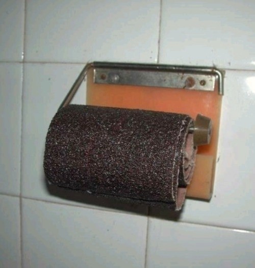 공개된 사진 속에는 화장실의 휴지걸이의 모습이 담겨 있다. 그런데 자세히 보면 휴지걸이엔 일반 휴지가 아니라 사포가 걸려있는 것. 만약 이 거친 사포를 사용하게 될 경우 피를 볼 수 있다는 의미로 '피 보는 휴지'라는 이름을 붙였다.