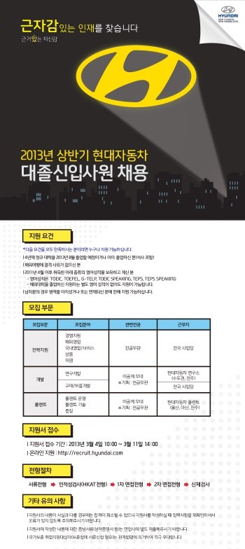 현대차의 ‘2013년 상반기 대졸신입사원 채용’ 지원서는 오는 11일까지 홈페이지를 통해 접수 받는다.