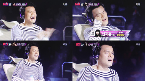 어느때와 마찬가지로, 이날 심사위원 중의 한 사람인 박진영의 모습이 유난히 눈에 뛴다. 원래가 감정을 잘 숨기지 못해 참가자들이 박진영의 표정을 보고 탈락여부를 짐작 할 정도라 같은 심사위원들로부터 주의를(?) 듣고 있는 상황.