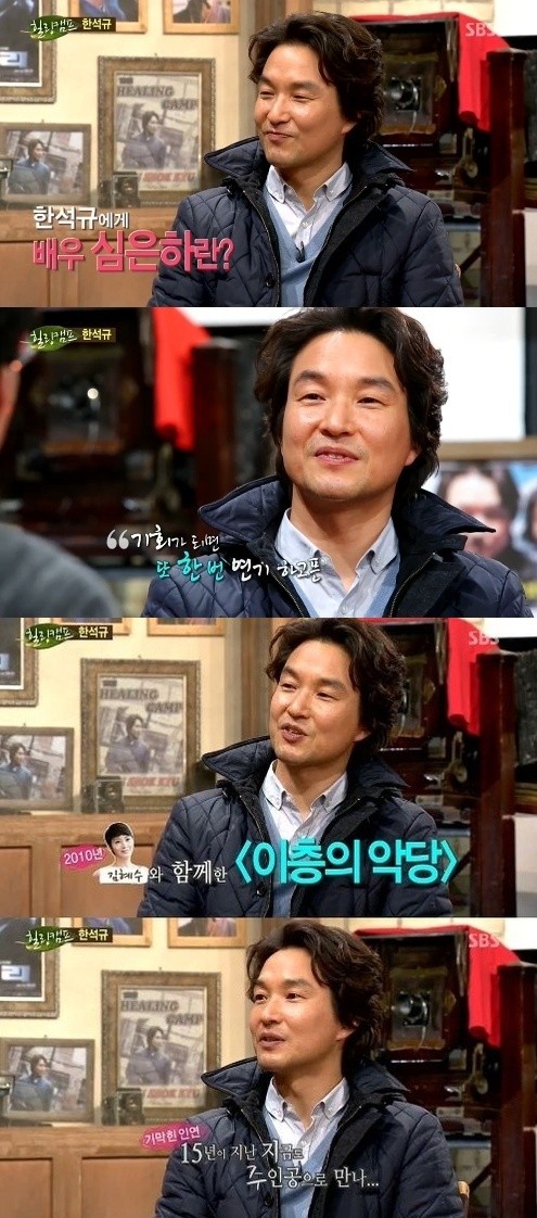 배우 한석규가 지난 2001년 결혼을 하면서 은퇴한 심은하를 추억했다.한석규는 4일 방송된 SBS '힐링캠프, 기쁘지 아니한가'(이하 힐링캠프)에 출연해 심은하와 다시 연기하고 싶다는 바람을 내비쳤다.