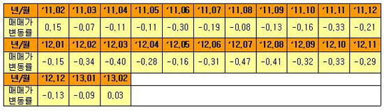 <2011년 2월~2013년 2월 서울 매매가 변동률> (단위: %)