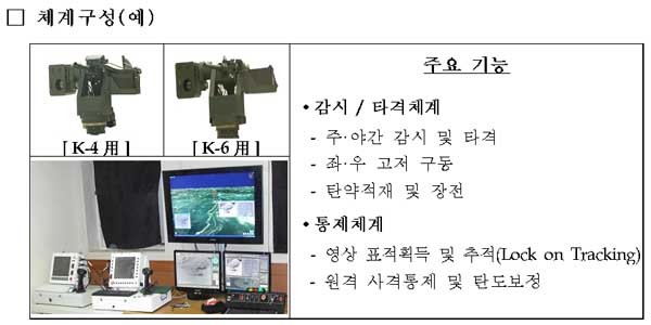 과학화경계시스템처럼 감시센서와 타격용 무기, 통제시스템으로 구성되어 있으며 육안으로 식별하기 어려운 먼 거리의 적 움직임을 우리 군 소초에서 실시간 감시할 수 있다.