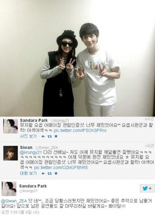 투애니원의 산다라박과 제국의 아이들 임시완이 의외의(?) 장소에서 포착됐다.산다라박은 6일 자신의 트위터에 “뮤지컬 ‘요셉 어메이징’ 관람 인증샷. 너무 재밌었어요. 요셉 시완과 찰칵. 어색어색”이라는 글과 사진 한 장을 공개했다.