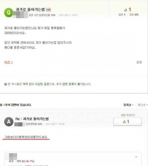 공개된 게시물에서 한 네티즌이 "2009년이 제일 행복했는데 그 당시로 돌아가는 방법은 없는 거냐"라는 다소 황당한 질문을 던진다. 이에 한 네티즌은 "그때보다 더 행복한 미래를 만드세요"라고 조언해 눈길을 끌었다.