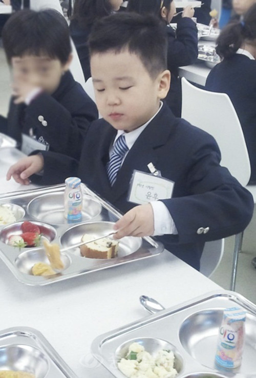 특히 윤후는 교복에 넥타이까지 착용해 귀여운 꼬마신사의 모습으로 급식판을 뚫어져라 쳐다봐 웃음을 자아낸다.윤후는 현재 MBC '일밤-아빠! 어디가?'에 출연해 '먹방(먹는 방송)'계의 샛별로 주목받고 있어, 해당 사진이 더욱 화제를 모으고 있다.