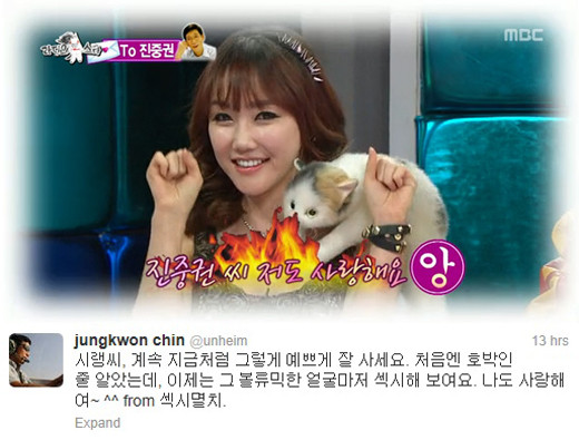 진중권 동양대학교 교수가 팝아티스트 낸시랭의 영상편지에 화답했다.진중권은 7일 자신의 트위터에 “시랭씨, 계속 지금처럼 그렇게 예쁘게 잘 사세요. 처음엔 호박인 줄 알았는데, 이제는 그 볼류믹한 얼굴마저 섹시해 보여요. 나도 사랑해여~ ^^ from 섹시멸치”란 글을 남겼다.