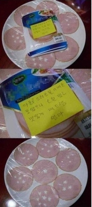 공개된 사진에는 엄마가 직접 쓴 메모와 함께 별무늬가 찍힌 슬라이스 햄 7장이 접시 위에 놓여 있다. 글쓴이는 “엄마가 냉장고에 드래곤볼 7개를 모아놨다고 하셨다. ‘뭔 소리야?’라는 궁금한 생각에 냉장고를 열었다”고 운을 뗐다.