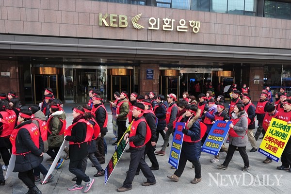8일 서울 중구 을지로2가 하나은행 앞에서 외환은행 직원 400여명이 하나지주의 외환은행 상장폐지 시도를 규탄하는 릴레이 집회를 이어갔다.