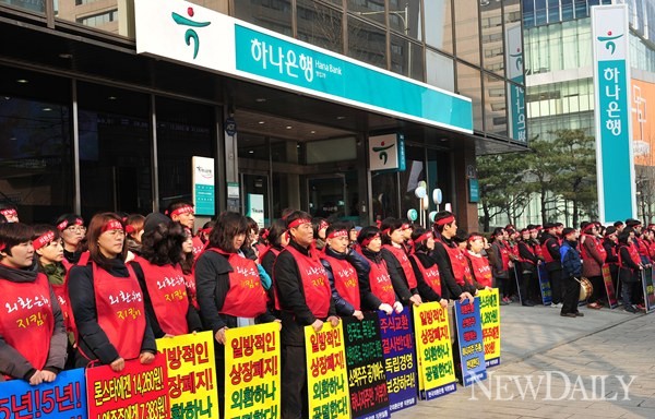 8일 서울 중구 을지로2가 하나은행 앞에서 외환은행 직원 400여명이 하나지주의 외환은행 상장폐지 시도를 규탄하는 릴레이 집회를 이어갔다.