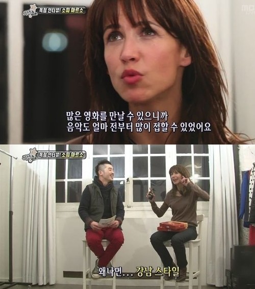이날 소피 마르소는 한국 문화를 접해봤냐는 리포터의 질문에 “프랑스에서도 한국에서 온 많은 영화를 만날 수 있다”면서 “음악도 얼마 전부터 많이 접할 수 있었다. ‘강남스타일’도 잘 알고 있다”라고 밝혔다.
