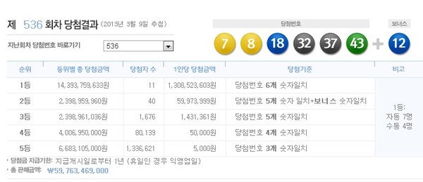 2013년 3월 9일 실시된 제536회 나눔로또 1등 당첨번호는 '7, 8, 18, 32, 37, 43'번이며, 2등 보너스 번호는 12번이다.