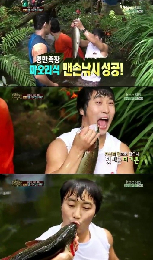 결국 김병만이 가장 먼저 자이언트 송어와 입맞춤을 하는 기쁨을 누렸다. 그는 단번에 송어의 아가미를 낚아채며 정글 1인자다운 면모를 과시했다. 김병만은 인터뷰에서 “마오리 부족분이 두 번 연속 아가미를 잡고 올리는 걸 보고, 비법이 저거다. 힘 있다고 해서 큰 물고기를 잡는 게 아니구나. 그들만의 비법이 있어야 하는구나”라고 설명했다.