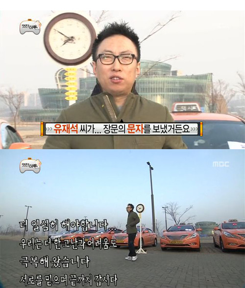 박명수가 유재석에게 받은 문자 내용을 공개했다.지난 9일 방송된 MBC 예능프로그램 ‘무한도전’에서 멤버들은 일일 택시기사로 변신해 각기 다른 콘셉트로 시민들과 멋진 하루를 보내는 모습이 전파를 탔다.