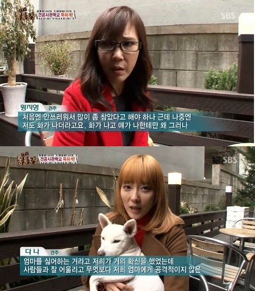 다나는 "6개월 전 유기견이었던 레이크와 한 가족이 됐다. 레이크는 사람에 대한 경계심이 강한 편인데 유독 엄마에게 더욱 심하다. 그러다 레이크가 엄마를 물어버리는 일이 발생했고 도저히 함께 살 수 없는 상황이 됐다"고 고민을 토로했다.