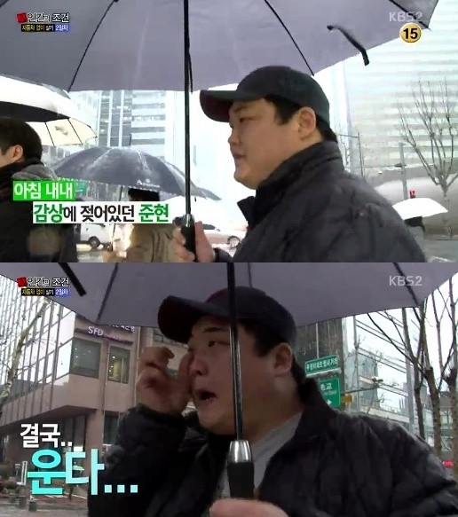 개그맨 김준현이 감상에 젖어 눈물을 보였다.지난 9일 방송된 KBS2 ‘인간의 조건’에서는 ‘자동차 없이 살기’ 미션을 수행하는 멤버들의 모습이 그려졌다.