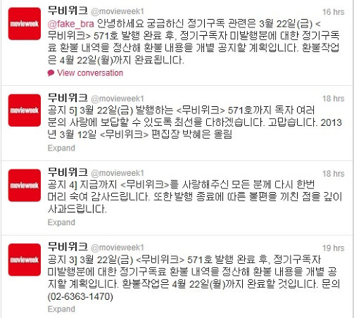 4월 22일까지 정기구독자의 미발행분에 대한 구독료 환불에 대해 환료할 계획입니다.지금까지 '무비위크'를 사랑해주신 모든 분께 다시 한 번 머리숙여 감사드립니다.