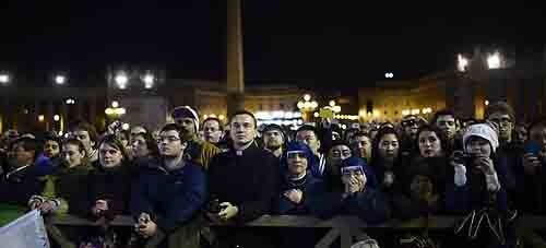 13일(현지시각) 저녁 이탈리아 바티칸의 성 베드로 광장에 모여든 수만 명의 신자들과 관광객들은 콘클라베(교황선출회의)가 열린 시스티나 성당 굴뚝에서 흰 연기가 피어오르자 환호성을 질렀다.