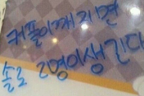 공개된 사진 속에는 '커플이 깨지면 솔로 2명이 생긴다'는 이유가 적혀있어 웃음을 자아낸다.