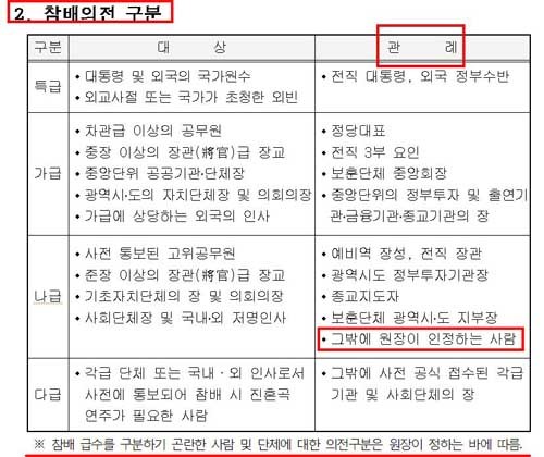 ▲ 국내 최대 국립 대전현충원 '전례업무편람' 중 '참배의전 구분'