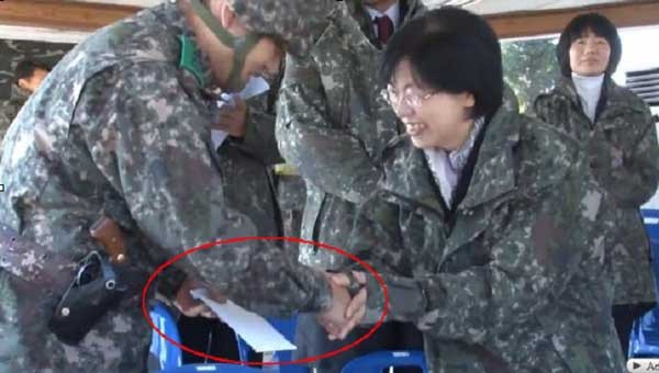 ▲ 2012년 11월 14일 통진당 이정희 후보가 백골부대를 방문하고, 금일봉 제공하는 모습. 초코파이 사 먹으라고 100만원을 제공하였으나, 대한민국 대통령을 모욕하고 북한의 입장을 대변한 종북 정당에서 주는 위문품을 받았기에 파장이 커지고 있다.