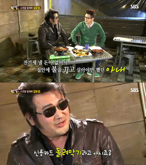 또한, 김보성은 “카드 돌려막기 아시죠? 한 달의 생활비를 무작정 신용카드로 결제하고, 결제할 돈이 없으니까 몇달 뒤에 그 돈을 모아서 갚는 식의 생활을 반복했다”고 울먹이며 아내에 대한 미안한 마음에 결국 눈물을 보였다.