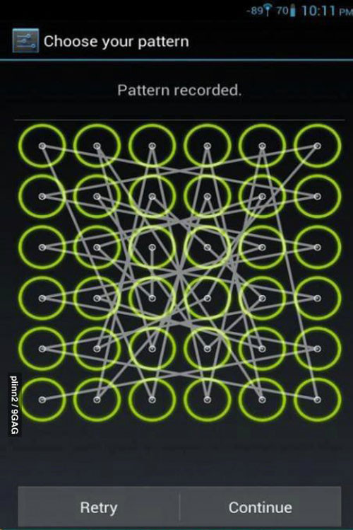 공개된 사진은 스마트폰 잠금 화면을 캡처한 것으로 핸드폰의 잠금장치인 패턴이 지나치게 복잡하게 설정돼 있다. 특히, 한눈에 봐도 외우기 힘들어보이며, 본인 조차도 잊어버리지 않고 패턴을 풀 수 있을 지 의문까지 들게 한다.