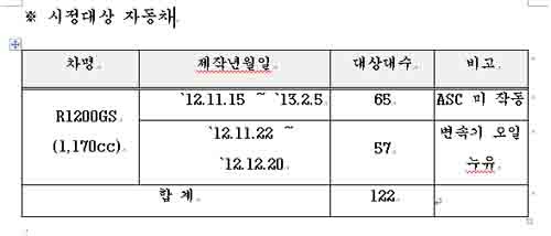 국토해양부는 BMW코리아(주)에서 수입, 판매한 이륜자동차 R1200GS 오토바이에서 2건의 제작결함이 발견돼 자발적으로 시정(리콜) 한다고 밝혔다.