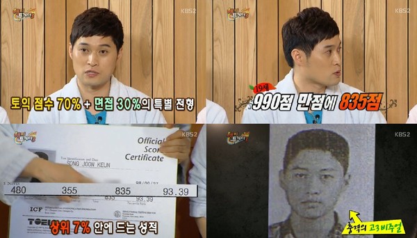 개그맨 송준근의 토익 성적이 공개돼 화제다.